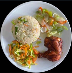 Egg Fried Rice, Chicken 2 pcs, Vegetable, Salad.